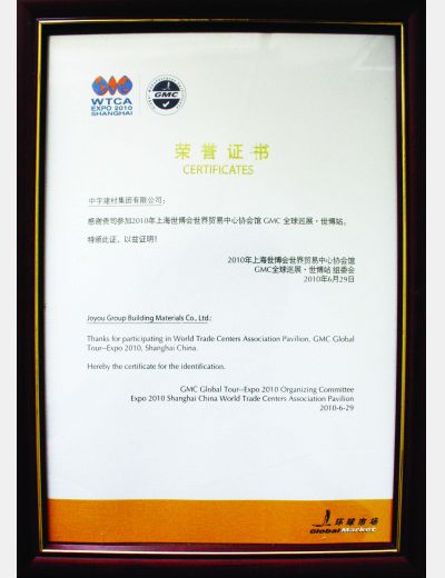 頒發(fā)單位:2010年上海世博會世界貿(mào)易中心協(xié)會館 GMC全球巡展·世博站組委會